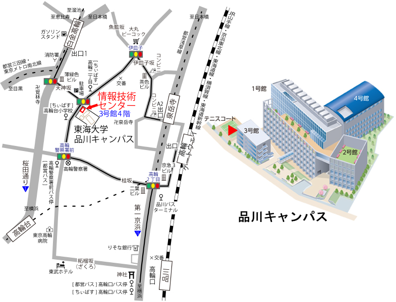 徒 歩 :出口から左に進む → 「高輪2丁目」交差点を渡り直進 → 「高輪警察署」交差点を右折。約15分
