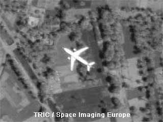 画像はIKONOSが撮影したエジプト・カイロ南部のナイル耕地上空をフライト中の航空機です。飛行機雲や空港に駐機している航空機をとらえた衛星画像はよく見かけますが、このようにフライト中の航空機が撮影された衛星画像は非常に珍しい例と言えるでしょう。