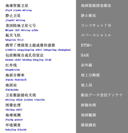 日本ではリモートセンシングのことを”遠隔探査”などと訳しますが、近年はリモートセンシングといえば理解されるようになりました。中国ではリモートセンシングを”遙感(yaogan)”と訳しています。