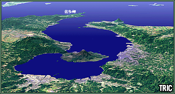 この画像ではシェーディングを加えることより、遠近感を表現しています。一番奥に見える岬は、本州最南端の佐多岬です。その反対側にある山は、開聞岳です。開聞岳は富士山に似た山の形から、薩摩富士とも呼ばれています。この画像でもみられるように鹿児島湾周辺は、日本でも独特な地形をしています。