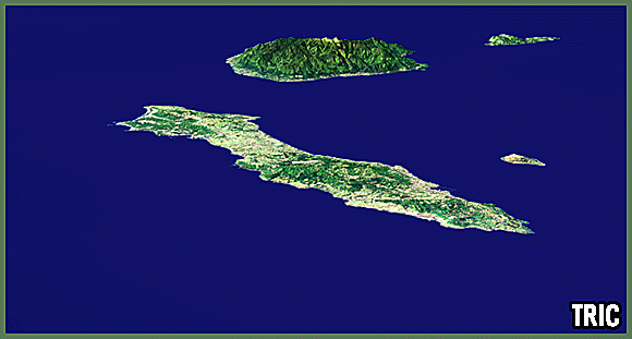鹿児島市から南に位置する屋久島と種子島の海底は、緩やかな大陸棚上にあります。この衛星画像の海の色は、海底の浅い地形を薄くし、深い地形を濃くして表現しました。周辺の海底地形は、ほぼ平坦であることが見てわかります。種子島は南北に細長い平らな島です。対照的に屋久島には高い山々がみられます。この島は海底から隆起してできたと言われています。屋久島のほぼ中心にある宮之浦岳は、九州で一番高い山です。衛星画像から森林が多いことが確認できます。屋久島は自然保護地域で1993年、世界自然遺産に登録されました。