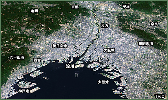 Landsat8号の衛星画像を使い、淀川(大阪湾)周辺の3D景観画像を作成しました。
