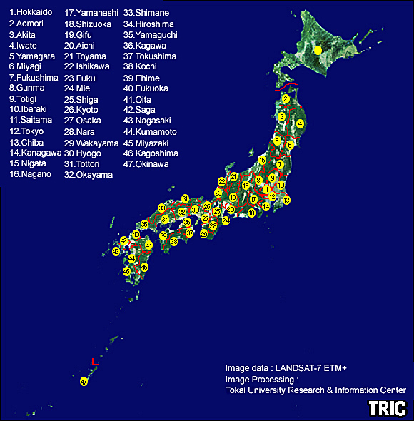 Here, click numbers or prefecture names of below image to see each prefecture of the LANDSAT images.