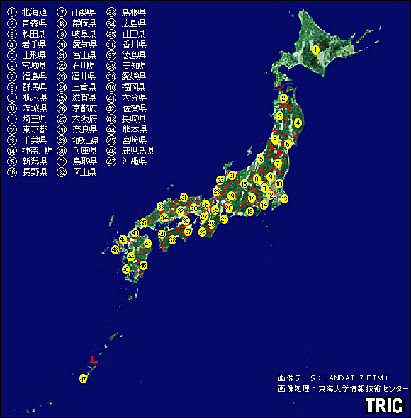 ここでは、各県の県名または日本列島上の番号をクリックするとランドサットの衛星画像が表示されます。