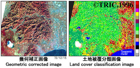 流域界のモデルとしては相模川流域を選定、まず同地域のランドサット画像を精密幾何補正した後、グラントゥルース(地上調査)データをもとにトレーニングエリアを厳密に選択し、マン・マシン・インタラクティーブ系を用いた再回帰的手法による土地被覆分類を実施しました。その結果、幾何学的精度が高く、分類精度も良好な土地被服分類結果が得られました。分類結果は縮尺10万分の1のカラーコード化された地図として出力しました。
