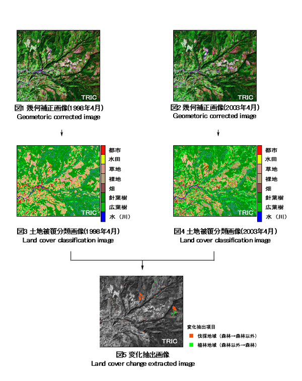 この調査では、精密幾何補正を行った2時期の衛星画像から分類処理と地上検証によって、それぞれ土地被覆図を作り(図3,4を参照)、2画像間の土地被覆の 変化を調べることで、森林の伐採や復活の情報を提供しています。(図5を参照)