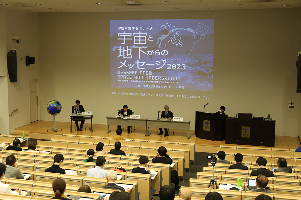 2023年12月16日(土)10:00から、東海大学品川キャンパスにおいて、「宇宙考古学セミナー★宇宙と地下からのメッセージ2023」を開催し、盛況に終わりました。 このセミナーは、情報技術センター設立の理念である「大学の研究成果を社会に還元すること」を目的として、情報技術センターと科研費の主催で実施されたものです。 当日は、中島孝(情報技術センター所長)の挨拶に始まり、海外からの3名の招聘者を交えて、エジプト、中国、サウジアラビアなどで実施している最前線の研究成果や、吉村作治氏(東日本国際大学総長・エジプト考古学)と鶴間和幸氏(学習院大学名誉教授・中国古代史)による「古代エジプト×古代中国の共通性について」と題したパネルディスカッションなど、これまで情報技術センターが主導してきた宇宙考古学と関わる9件の発表がありました。 参加者数は138名でした。