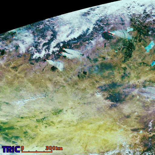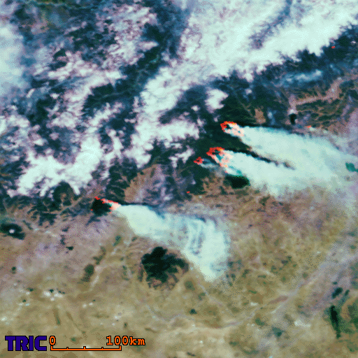 モンゴル草原・森林で1月に起きた火災は、5月になっても延焼が続いている。東海大学では、日本で報じられた4月上旬から、TSICでMOS-1 MESSRおよびNOAA AVHRRデータを連続的に受信してその状況を継続的にモニターし、TRICで画像解析を実施した。成果は、5月10日のNHKハイビジョンニュースで放映された。NOAA AVHRR画像は、首都ウランバートルに近い地域での火災の模様を写しだし、広域多発の草原火災の消化活動の難しさを物語っている。MESSRが捉えた消失地域は黒く現れている。MESSR画像は、全体にモノトーンで4月のモンゴル草原の植生が枯れ草に近いことを示している。