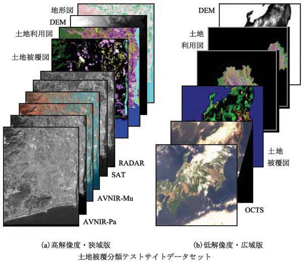 1999年以来3年間にわたって開発を進めてきた高解像度・狭域版と低解像度・広域版の2つの土地被覆分類テストデータセットが完成しました. 高解像度・狭域版は縮尺1:25,000の地形図2枚に相当する東西11km×南北15kmのエリアを,また低解像度・広域版は日本列島中央部の標準地域第1次メッシュ8×8区画に相当する640km四方のエリアをテストサイトとしています.そのテストサイトエリア内をそれぞれ8m,250m間隔のグリッドで2時期マルチ衛星センサ画像,土地被覆図,および土地利用図やDEMなどその他の地理情報を集積したものです.土地被覆図は判読によって作成されたものです. この2種類のテストデータセットを利用することによって,多種多様な土地被覆分類アルゴリズムの性能・特性の評価が可能になり,アルゴリズム開発はもちろん,ユーザがどのようなアルゴリズムを使用すべきなのかという指針を得ることが可能となります.また,都市計画や防災計画などの各種地域計画立案やリージョナルな環境監視などに基礎データとして使用される土地被覆図の作成を分類アルゴリズムの観点から支援することができるようになります.従来,公開されているこのようなテストデータセットはありませんでしたが,NASDA(宇宙開発事業団)のサーバから公開される予定となっています. (福江潔也) |
