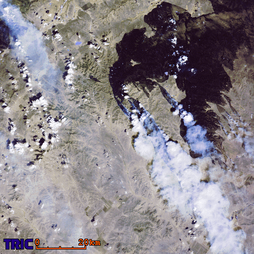 モンゴル草原・森林で1月に起きた火災は、5月になっても延焼が続いている。東海大学では、日本で報じられた4月上旬から、TSICでMOS-1 MESSRおよびNOAA AVHRRデータを連続的に受信してその状況を継続的にモニターし、TRICで画像解析を実施した。成果は、5月10日のNHKハイビジョンニュースで放映された。NOAA AVHRR画像は、首都ウランバートルに近い地域での火災の模様を写しだし、広域多発の草原火災の消化活動の難しさを物語っている。MESSRが捉えた消失地域は黒く現れている。MESSR画像は、全体にモノトーンで4月のモンゴル草原の植生が枯れ草に近いことを示している。