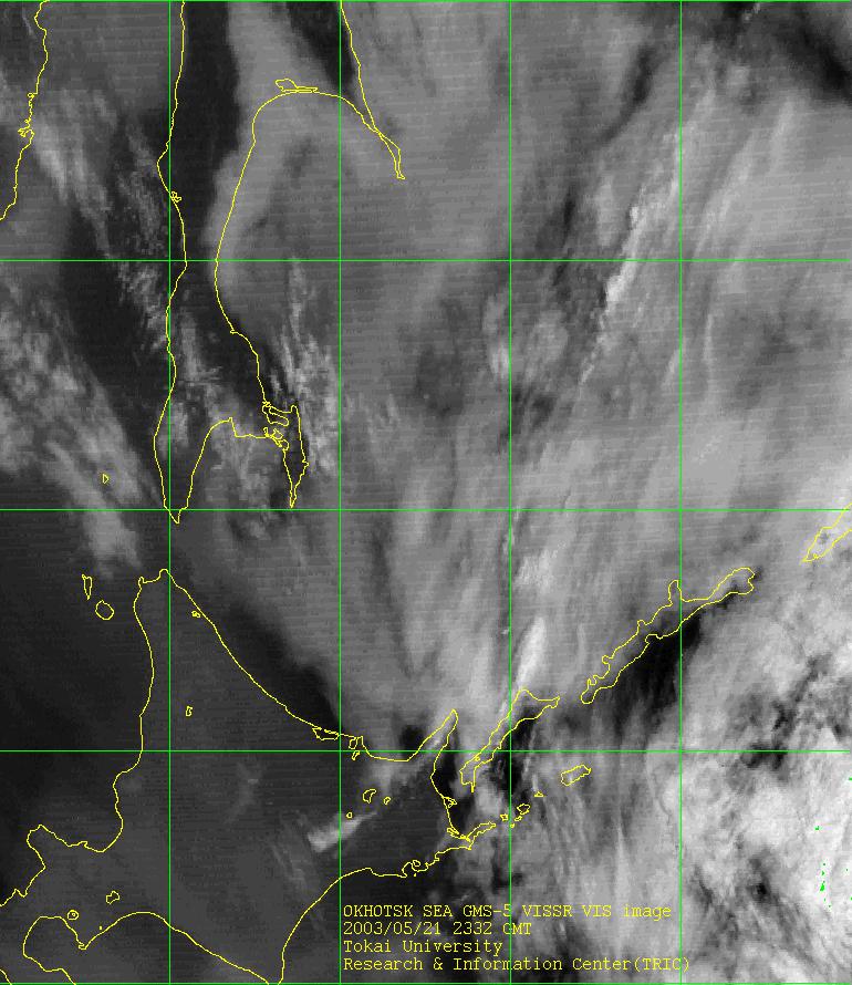 この画像は、気象衛星GMS-5が観測したオホーツク海周辺の可視画像です。日中は1時間毎に最新の画像に更新されます。
