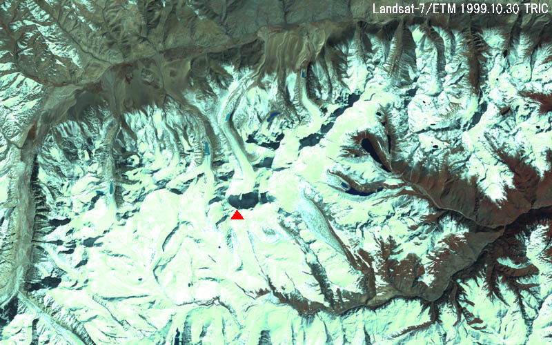 1999年10月30日撮影 Landsat-7号 TM画像 ▲付近がクーラカンリ主峰(7,538m)
