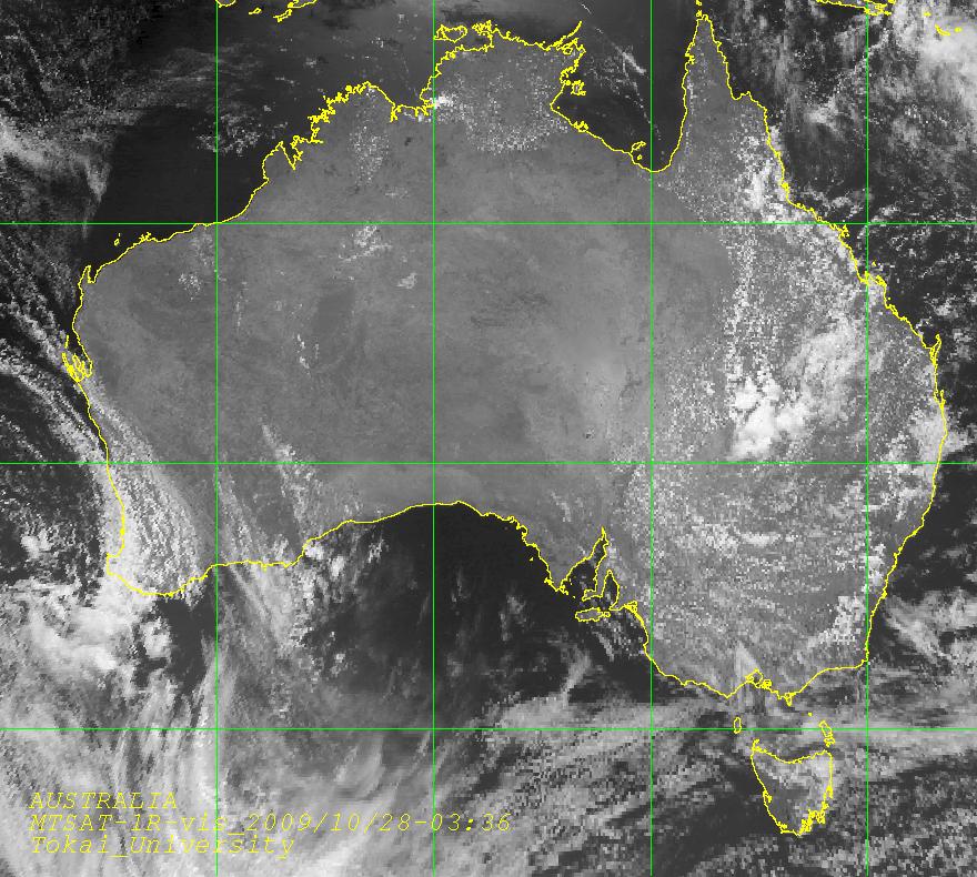 概要 東海大学ソーラー・カー・チームは、2009年10月にソーラーカーTokai ChallengerでオーストラリアのソーラーカーレースGlobal Green Challenge(10月24日~31日)に挑み、みごと優勝しました。ソーラーカーレースでは、天候、日射状況の把握が重要です。東海大学情報技術センター/宇宙情報センターでは、同チームを支援するため、大会期間中、気象衛星ひまわり(MTSAT-1R)が観測したオーストラリアの最新画像をこのページに掲載しました。下の画像は、Tokai Challengerがアデレードにゴールインした10月28日現地時間14:39ごろの可視画像です。 |