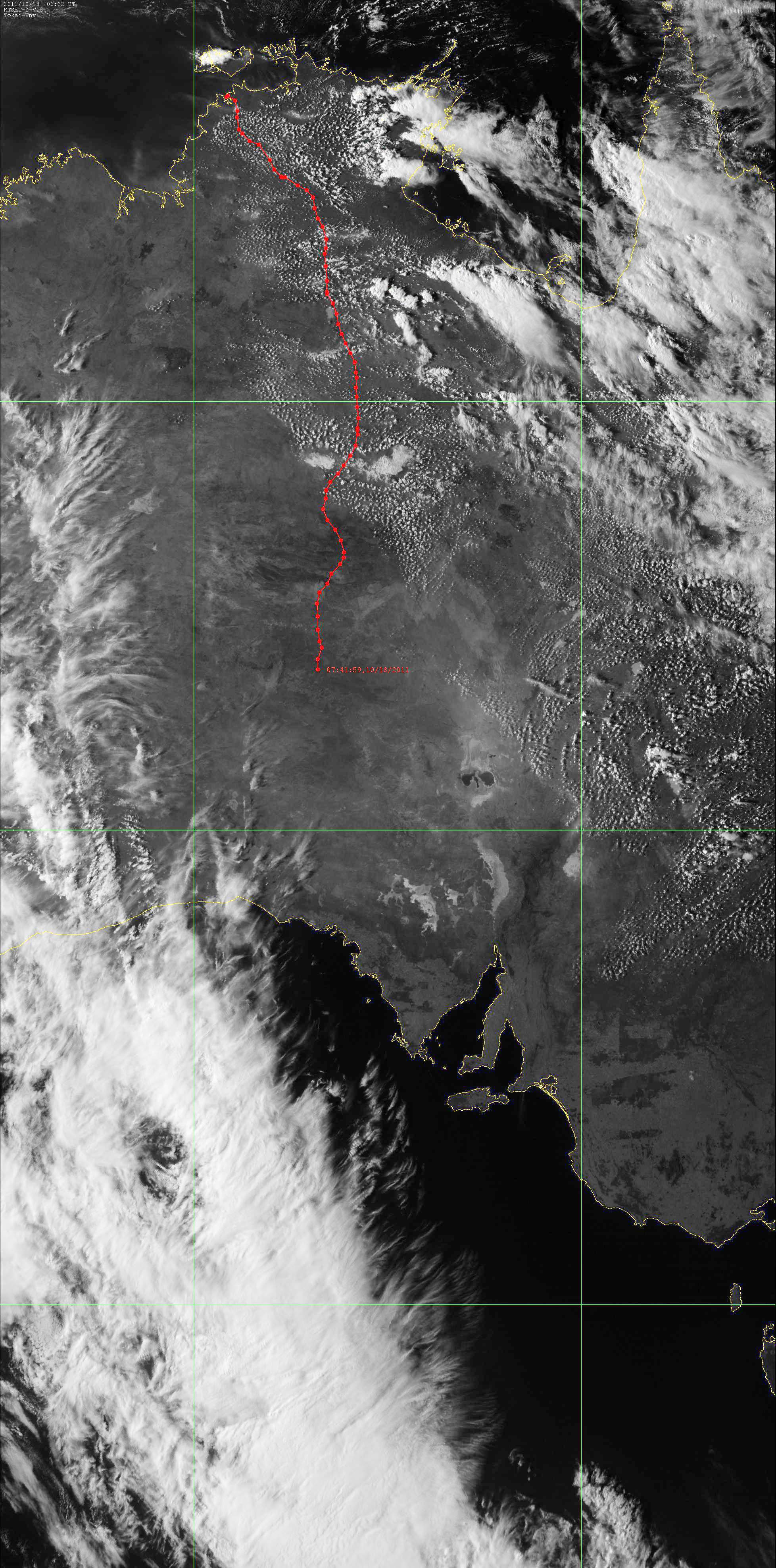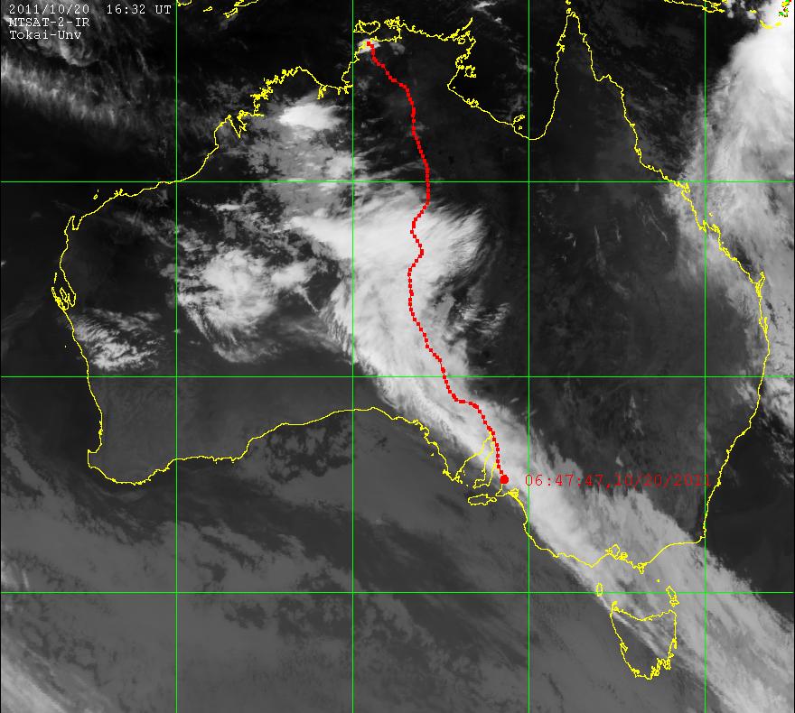 概要 東海大学ソーラー・カー・チームは、2011年10月にソーラーカーTokai Challengerでオーストラリアのソーラーカーレース「ワールド・ソーラー・チャレンジ(WSC)」(10月16日~23日)に挑み、みごと大会2連覇を飾りました。ソーラーカーレースでは、天候、日射状況の把握が重要です。東海大学情報技術センター/宇宙情報センターでは、同チームを支援するため、大会期間中、気象衛星ひまわり(MTSAT-2)が観測したオーストラリアの最新画像の上に、同チームのGPS端末から10分置きに自動送信されてくるTokai Challengerの位置情報をプロットした画像を同チームに提供しました。下の画像は、Tokai Challengerがアデレードにゴールインした10月20日の可視画像です。 |