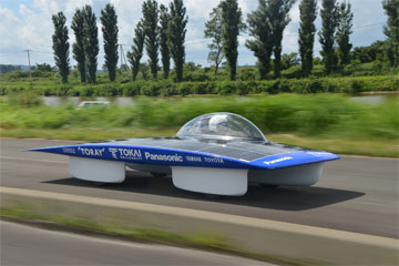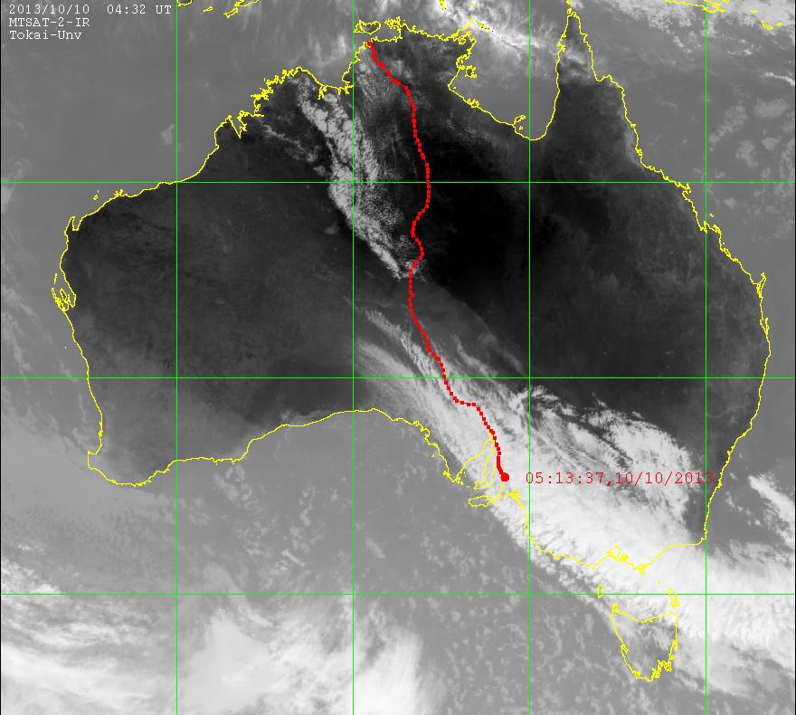 概要 東海大学ソーラー・カー・チームは、2013年10月にオーストラリアで開催されるのソーラーカーレース「ブリジストン・ワールド・ソーラー・チャレンジ2013」にソーラーカーTokai Challengerで参戦しました。同レースは、太陽光のみを原動力として、オーストラリア連邦のダーウィンとアデレード間の全長3,000kmを走破するタイムを競う世界最大級のソーラーカーレースです。今回、惜しくも3連覇は逃しましたが、みごと2位でゴールインし、その安定した実力を世界に示しました。関係者の皆様、ご苦労様でした。このサイトには大会期間中、気象衛星ひまわり(MTSAT-2)が観測したオーストラリアの最新画像上にTokai Challengerの前日までの経路をプロットしてこのページに掲載しました。この画像はTokai Challengerゴール時(現地時間14:35)の画像です。 |