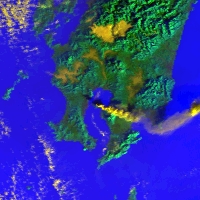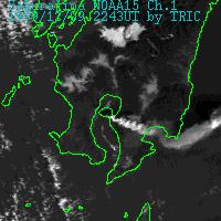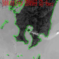 この画像は気象衛星NOAAの可視赤外放射計AVHRRが観測した熱赤外チャンネル(Ch.4;10.30-11.30micron)と(Ch.5;11.50-12.50micron)による差画像です。噴煙と雲域の識別について、観測波長帯が異なる2つの熱赤外チャンネルの差を用います。この差より、以下の様な傾向が見られます。