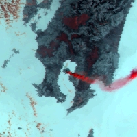 この画像は気象衛星NOAAの可視赤外放射計AVHRRが観測した中間赤外チャンネル(Ch.3),熱赤外チャンネル(Ch.4),熱赤外チャンネル(Ch.5)を、それぞれRed・Green・Blueに割り当てたRGB合成画像(夜間版)です。 差画像では識別が困難な場合があるため、噴煙を強調する目的でカラー合成を施しました。中間赤外チャンネルをRedに割り当てたため、大規模な噴火があった際は噴煙は赤く表示されます。 Red…Ch.3 Green…Ch.4 Blue…Ch.5 ※観測領域以外の場合は、画像全体が灰色に表示されます。