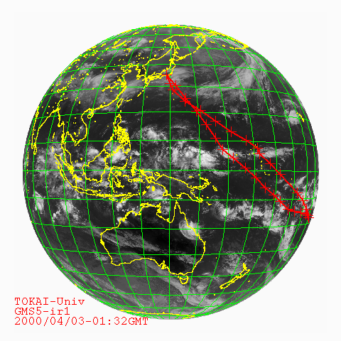 東海大学情報技術センター/宇宙情報センターでは、衛星データ利用研究の一環として、2000年の第31回の海外研修航海から気象衛星ひまわり(GMS5号)が観測した最新の地球の画像に航海中の望星丸の航跡を随時プロットしてホームページで公開するサービスを開始しました。ここに示す画像はその全航跡を赤線でプロットしたものです。