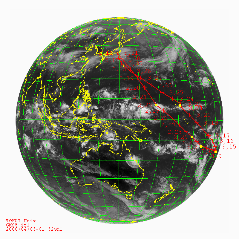 赤い線が望星丸の航跡 黄色い丸印は寄港地
