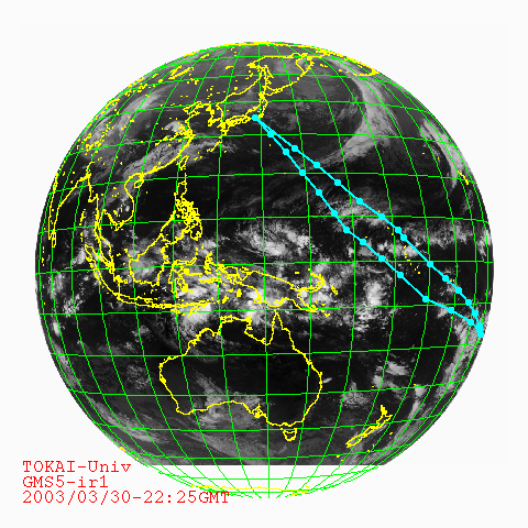 東海大学情報技術センター/宇宙情報センターでは、衛星データ利用研究の一環として、2000年の第31回の海外研修航海から気象衛星ひまわり(GMS5号)が観測した最新の地球の画像に航海中の望星丸の航跡を随時プロットしてホームページで公開するサービスを開始しました。ここに示す画像は望星丸が帰港した2003年3月31日のGMS画像に第34回研修航海の全航跡を空色の線でプロットしたものです。