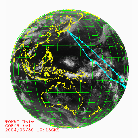 2004年2月15日、望星丸は清水港を出港し、46日間の研修航海を終え、3月31日に清水港に帰港しました。このページでは、研修航海中、気象衛星GOES-9が観測した最新の地球の画像に望星丸の航跡・現在位置をプロットしたものを毎時公開して来ました。望星丸の帰港を持って、今回のサービスは終了します。下の画像は、3月31日の衛星画像に今回の望星丸の全航路をプロットしたものです。関係者の皆様、お疲れ様でした。