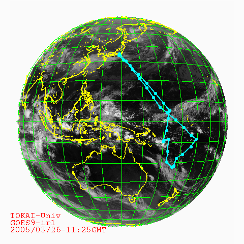 概要: 2005年2月15日、望星丸は清水港を出港し、41日間の研修航海を終え、3月27日に清水港に帰港しました。このページでは、研修航海中、気象衛星GOES-9が観測した最新の地球の画像に望星丸の航跡・現在位置をプロットしたものを毎時公開して来ました。望星丸の帰港を持って、今回のサービスは終了します。下の画像は、3月26日の衛星画像に今回の望星丸の全航路をプロットしたものです。関係者の皆様、お疲れ様でした。 |