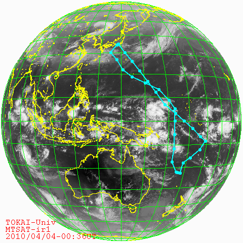 概要: 2010年2月14日に清水港を出港した望星丸は、50日間の研修航海の旅を終え、4月4日、無事に清水港に帰港しました。このページでは、研修航海中、気象衛星MTSAT-1R(ひまわり6号)が観測した最新の地球の画像に望星丸の航跡・現在位置をプロットしたものを毎時公開しました。関係者の皆様、お疲れ様でした。 |