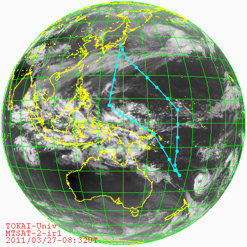 概要: 望星丸は、2011年2月15日12:30に清水港の日の出埠頭を離岸し、41日間の研修航海の旅を終え、3月27日、無事に清水港に帰港しました。このページでは、研修航海中、気象衛星MTSAT-2(ひまわり7号)が観測した最新の地球の画像に望星丸の航跡・現在位置をプロットしたものを毎時公開しました。関係者の皆様、お疲れ様でした。 |