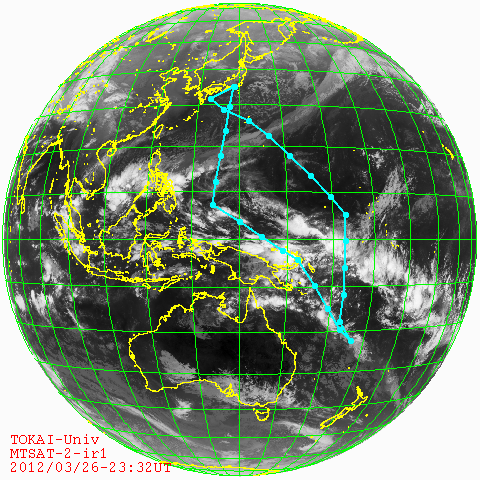 概要: 望星丸は、2012年2月15日に清水港の日の出埠頭を離岸し、41日間の研修航海の後、3月26日、無事、清水港に帰港しました。このページでは、研修航海中、気象衛星MTSAT-2(ひまわり7号)が観測した最新の地球の画像に望星丸の航跡・現在位置をプロットしたものを毎時公開しました。関係者の皆様、お疲れ様でした。 |