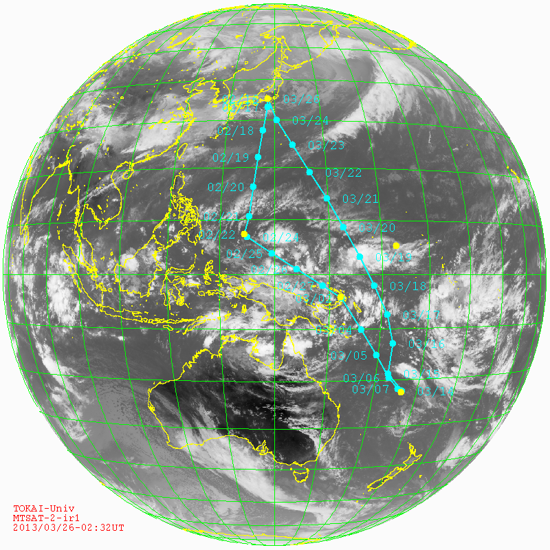空色線が望星丸の全航跡 黄色い丸印は寄港地