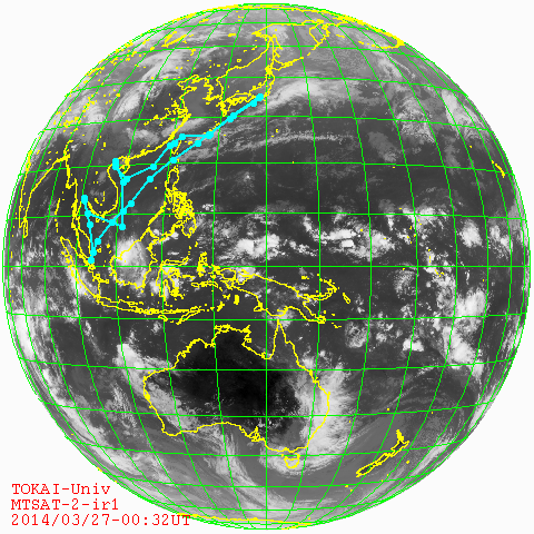 概要: 望星丸は、2014年2月15日に清水港を出港し、41日間の研修航海の後、3月27日、無事、清水港に帰港しました。このページでは、研修航海中、気象衛星ひまわり7号が観測した最新の地球の画像に望星丸の航跡・現在位置をプロットしたものを毎時公開しました。関係者の皆様、お疲れ様でした。 |