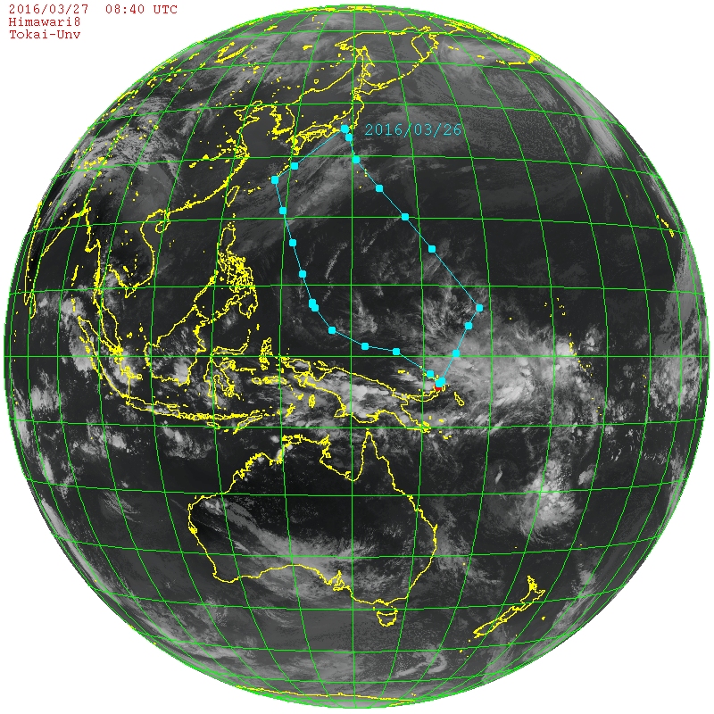 気象衛星ひまわり8号の画像にプロットした