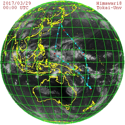 概要: 望星丸は、2017年2月16日に横浜港を出港し、3月29日に42日間の研修航海を終え、清水港に帰港しました。関係者の皆様、お疲れ様でした。このページでは、研修航海中、気象衛星ひまわり8号が観測した最新の地球の画像に望星丸の航跡・現在位置をプロットしたものを毎時公開しました。下記の画像は研修航海の全航路をひまわり画像上にプロットしたものです。 |