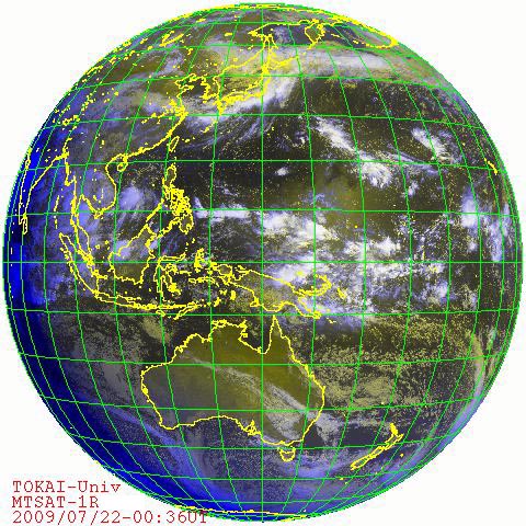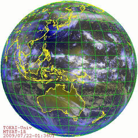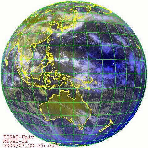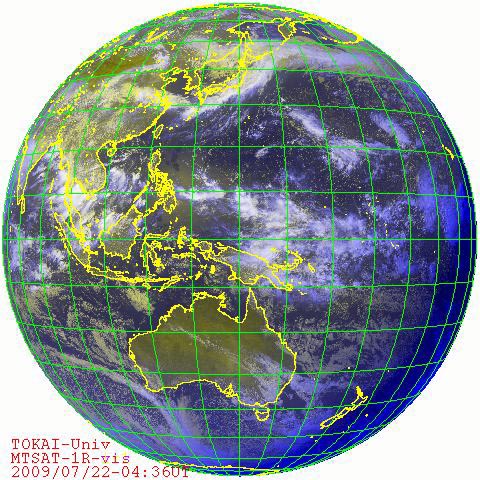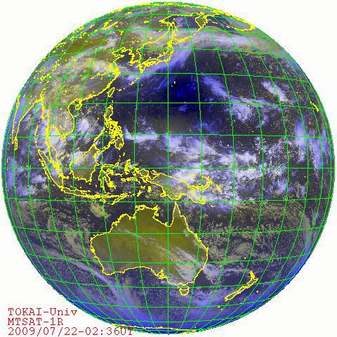 画像の横に赤字で書かれている日時はMTSATの観測開始時間を世界時UTで示したものです。例えば、02:32UTは+9時間すると日本標準時11:32JSTとなります。観測時間によって全球観測か半球観測が行われています。