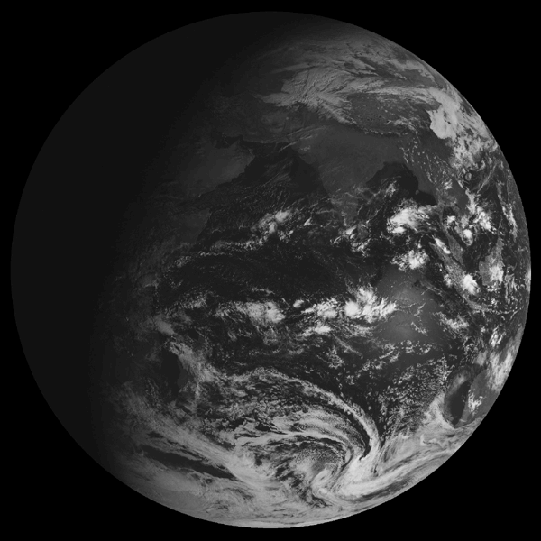 この画像は、インド洋上にある静止気象衛星Meteosatが2002年12月4日04:00 UTCから12:00にかけて30分おきに捉えた日食の影の動画像です。日食は、地球と太陽の間に月が入ることによって、太陽の一部または全部が隠れる現象ですが、これにより地球に月の影ができます。この動画を見ると、画像左側に位置するアフリカ大陸から右下方のインド洋にかけて、黒い影が移動していく様子がよく分かります。赤道上を右から左に移動していく白い円形状のパターンは太陽の反射光です。